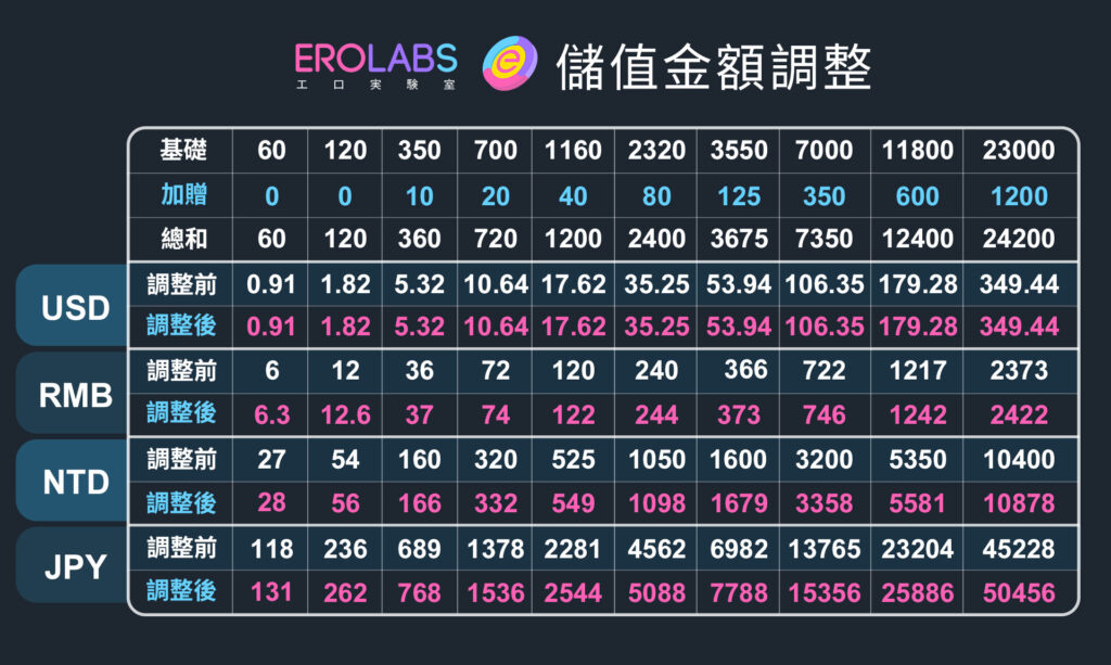 為因應近期國際匯率的持續波動,EROLABS平台儲值系統預計將於9/29 (四)系統維護後進行ECoin儲值金額之調整,同時因應此次匯率調整,GASH點卡可獲得的ECoin亦會隨之調整,屆時請您留意付款頁面的金額與可獲得的ECoin數量後再進行購買。造成您的不便,敬請見諒。