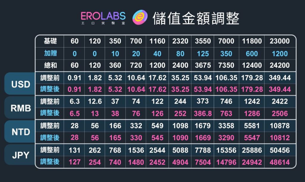 為因應近期國際匯率的變化,EROLABS平台儲值系統預計將於12/12 (一)金流系統維護後進行ECoin儲值金額之調整,同時為因應GASH點卡通路成本,GASH點卡可獲得的ECoin數量亦會隨之調整,若您手上尚有GASH點卡尚未使用,建議於上述時間前儲值完畢。屆時請您留意付款頁面的金額與可獲得的ECoin數量後再進行購買。造成您的不便,敬請見諒。